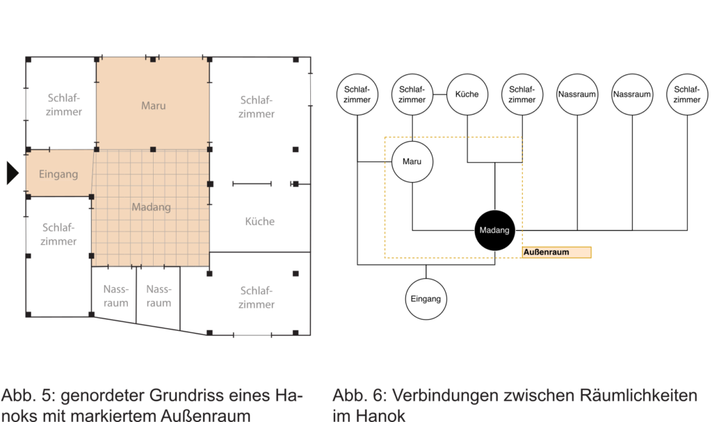 Historisch resultierend bietet sowohl der madang als auch das Peristyl die Möglichkeit, den Hausherrn eine Fläche zu bespielen, die als Werkstätte, Lagerplatz oder Veranstaltungsort genutzt werden kann. Hierbei wird darauf geachtet, dass die Bodenfläche größtenteils frei bleibt, damit eine Klimatisierung des Hofes ermöglicht werden kann. Beide Höfe wirken so als Klimagerät und Lichthof für die Typologie. Beim Hanok fungiert das maru als Spielpartner für den madang.