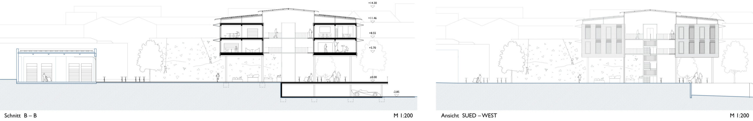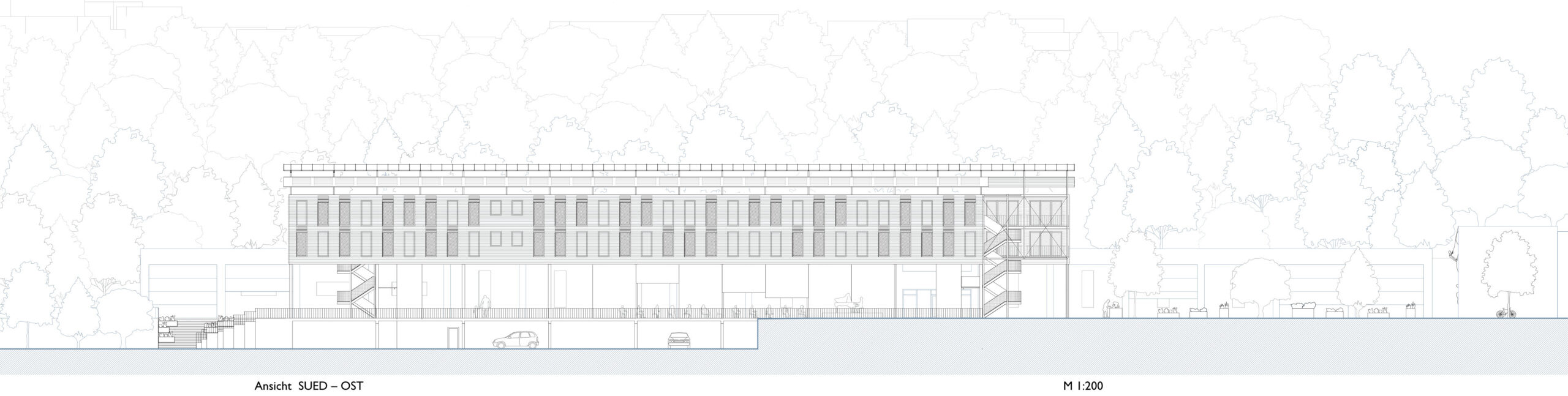 Die Außenwände der Riegel sind als hinterlüftete Holzständerkonstruktion mit horizontalen Holzlamellen als äußere Bekleidung ausgeführt (u-Wert: 0,17 W/(m²K)). Die Aussenfassade folgt einem klaren Rhythmus von sich abwechselnden geöffneten und geschlossenen Wandflächen. Dieses gleichmäßige Verhältnis erzeugt eine ruhige, lineare Struktur, die die Länge der Baukörper betont. Gleichzeitig reagiert die Fassade auf Nutzung und Klima. Im Bereich der Fenster sind die Holzlamellen als bewegliche Elemente ausgebildet. Sie funktionieren wie nach oben klappbare Hebe-Faltläden und dienen als variabler Sonnenschutz. Dadurch verändert sich das Fassadenbild je nach Nutzung, Tageszeit und Lichtverhältnissen und erhält eine lebendige, dynamische Wirkung.