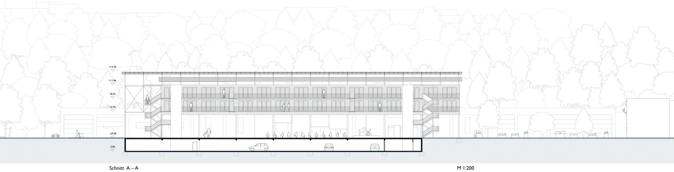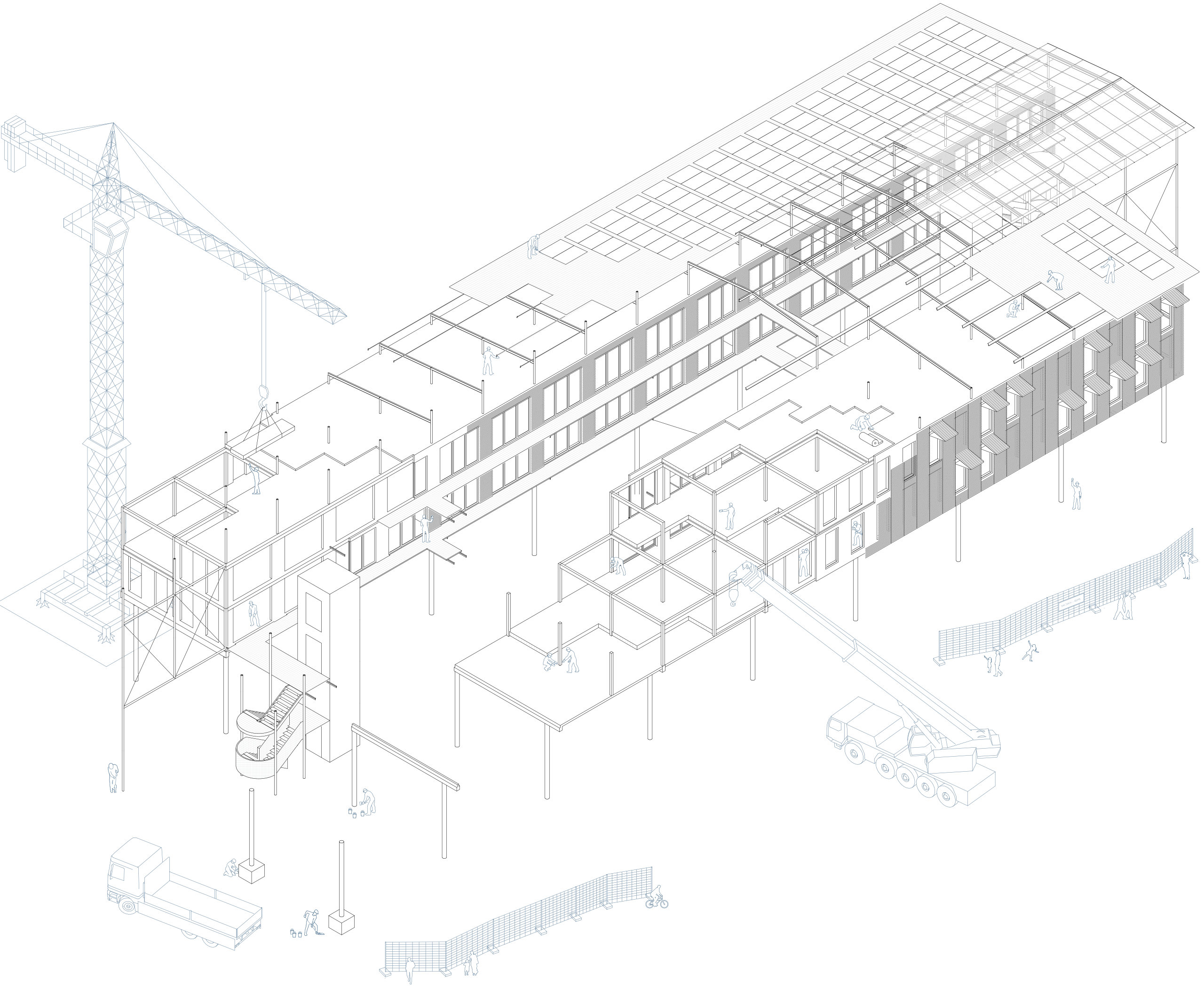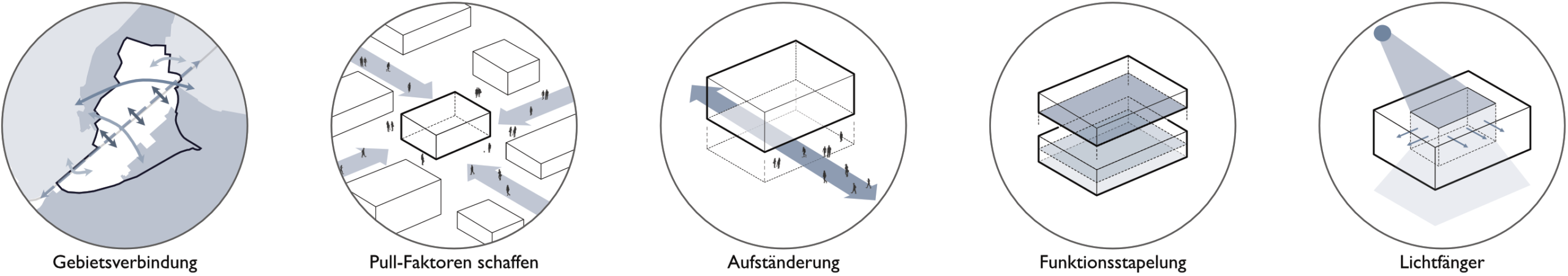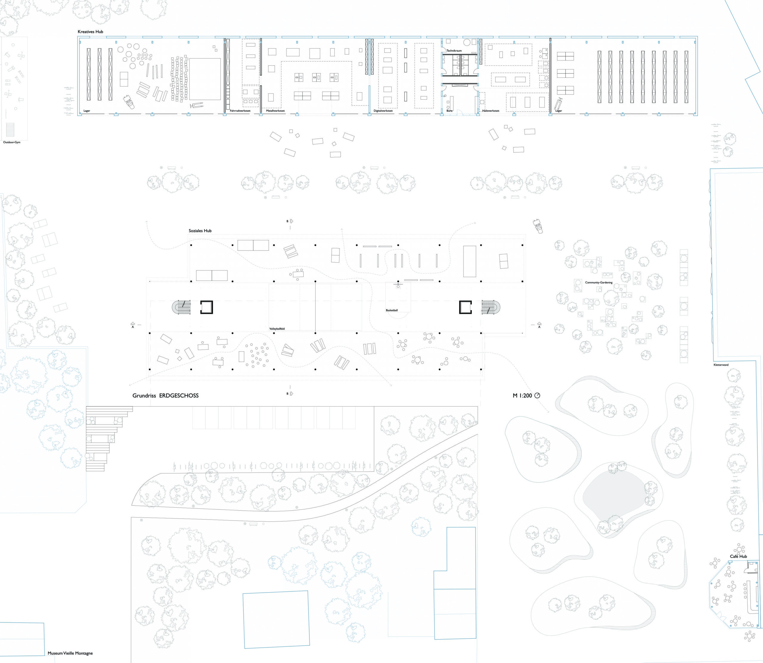 „Statt abgeschlossener Hallen entsteht hier eine offene, aufgeständerte Struktur, die öffentliche, halböffentliche und produktive Nutzungen kombiniert.“