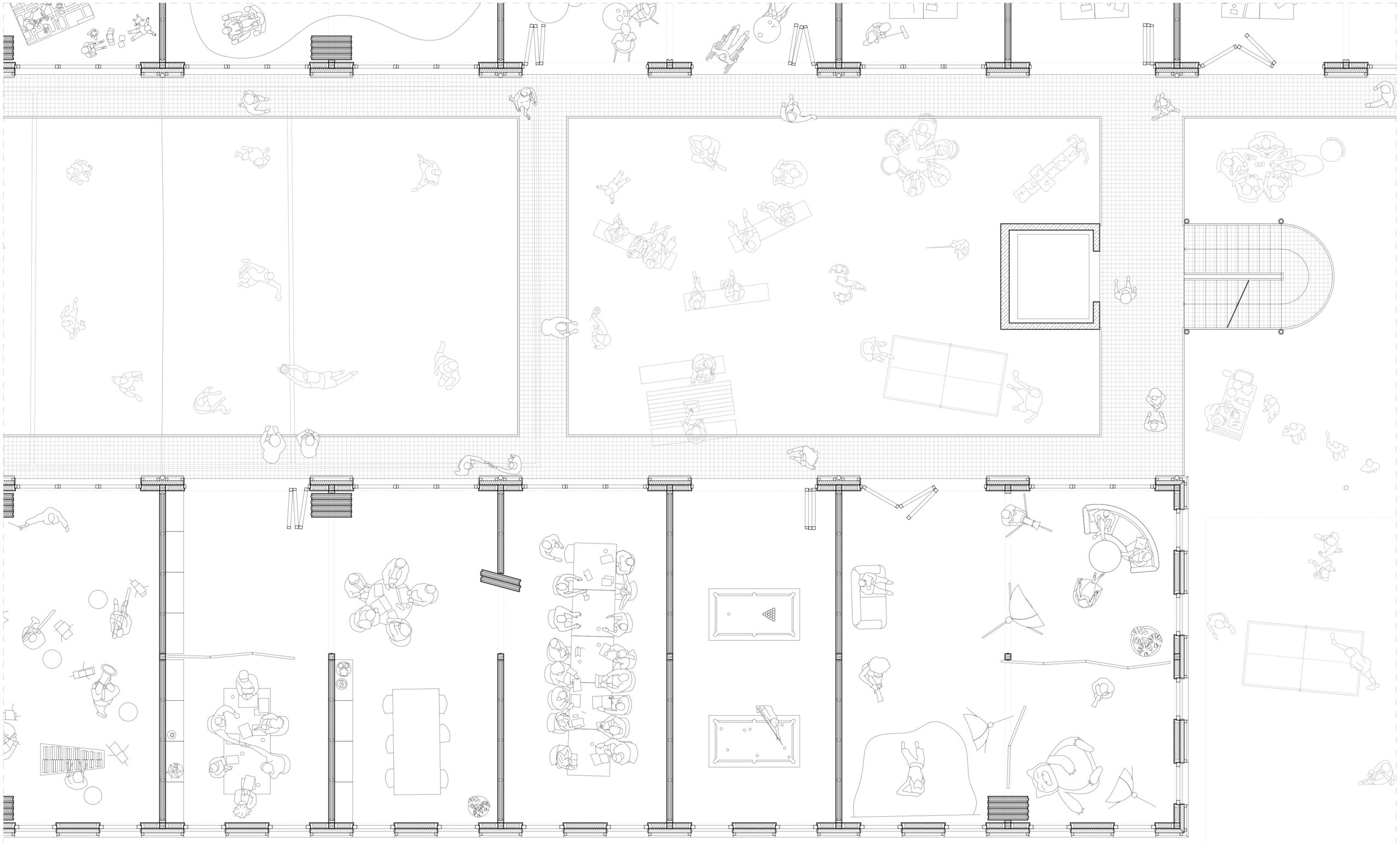 Die Räume im Obergeschoss sind modular aufgebaut und können je nach Bedarf zusammengelegt oder unterteilt werden. Dadurch sind sowohl kleine, abgeschlossene Einheiten als auch größere, gemeinschaftlich genutzte Flächen möglich. Die Tragstruktur und das Erschließungssystem erlauben eine langfristige Anpassung an wechselnde Anforderungen, wodurch der Grundriss offen für zukünftige Entwicklungen bleibt.