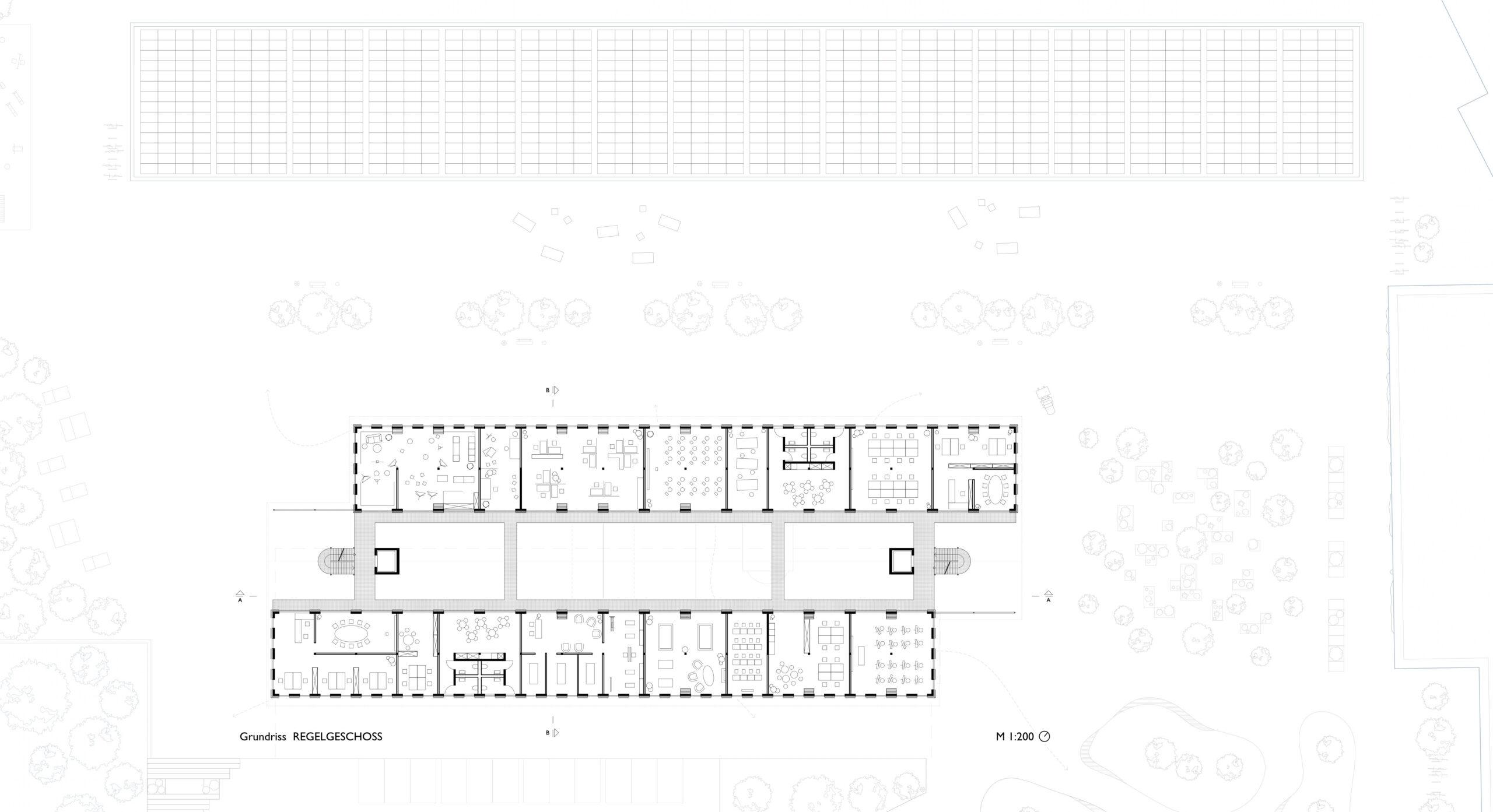 Die Grundrissstruktur des Gebäudes folgt einem klaren, linearen Prinzip, das Flexibilität und Nutzungsvielfalt ermöglicht. Die beiden gegenüberliegenden Baukörper sind als durchgängige Riegel organisiert, in denen sich einzelne Nutzungseinheiten entlang der Fassaden aufreihen. Diese Anordnung schafft gut belichtete Räume mit direktem Außenbezug und klarer Orientierung.