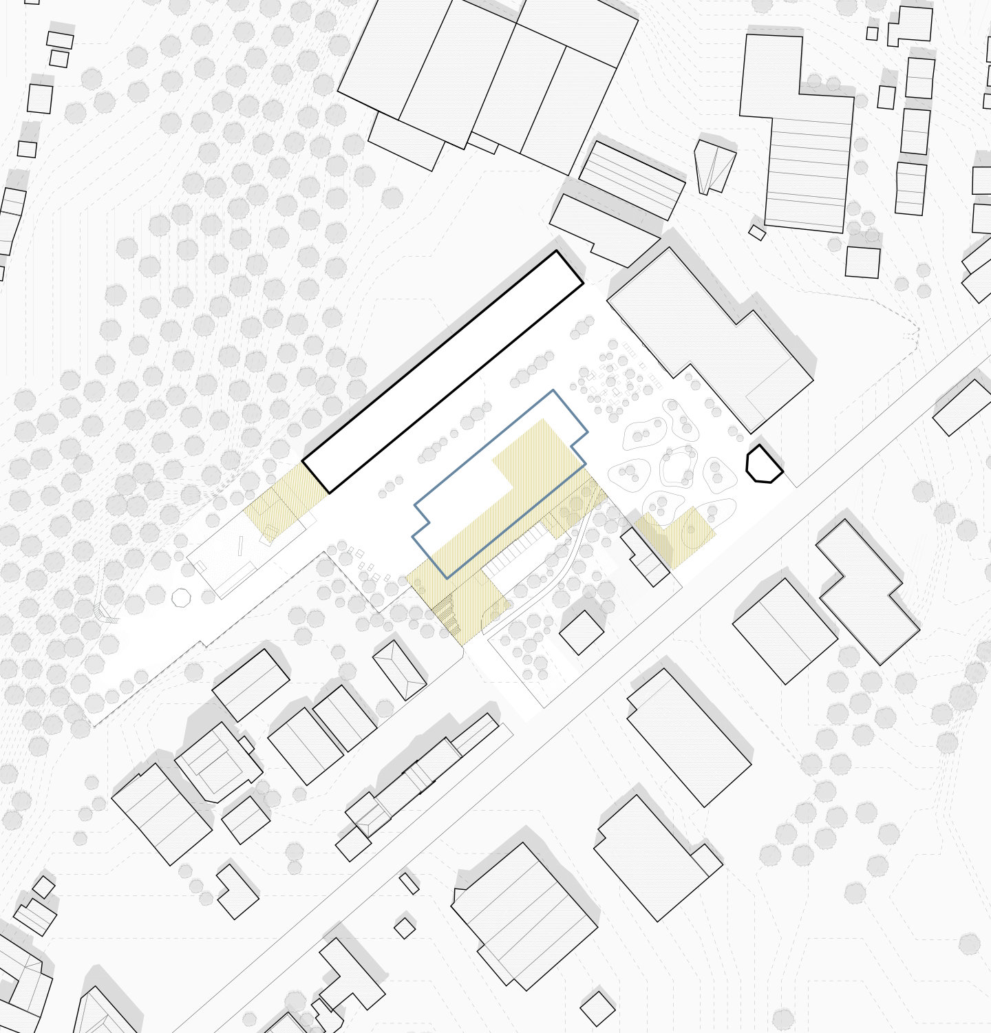 Das Grundstück selbst ist mehrfach angebunden und wirkt als verbindendes Gelenk zwischen unterschiedlichen Ebenen und verschiedenen Gebieten. Der Hauptzugang liegt an der Lütticher Sraße und bildet die adressbildende Eingangssituation. Hier erfolgt sowohl der Besucherzugang als auch die funktionale Anlieferung. Von diesem Punkt aus öffnet sich das Gelände in Richtung des zentralen, überdeckten Freiraums unter dem aufgeständerten Neubau. Durch die Versetzung der Baukörper öffnet sich Raum in der Mitte für die Besucher.